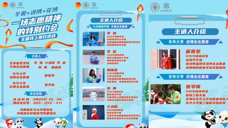 3月22日,我校团委联合北京服装学院团委开展“一场志愿精神的特别约会”线上主题团日活动。多位来自冬奥会、进博会、花博会的青年志愿者相聚交流,700余名团员青年线上参加,京沪两地团员青年“云连线”,畅谈志愿服务的点滴感动与团员青年的责任担当。